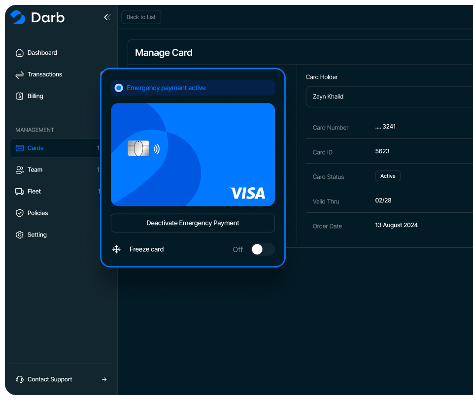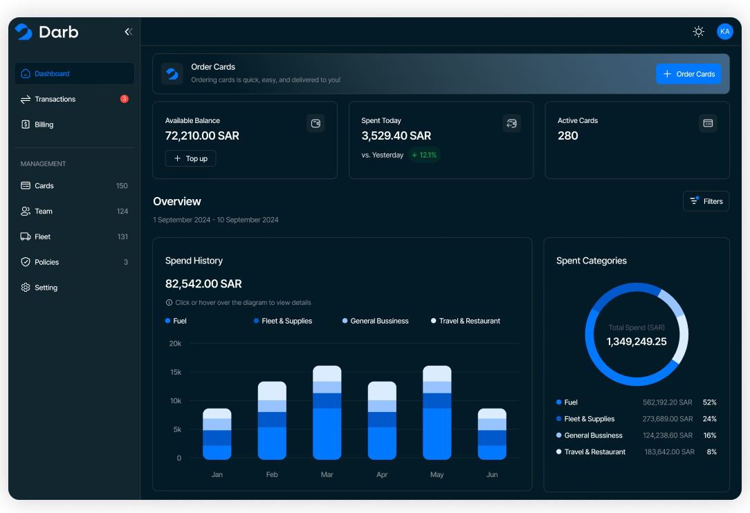 درب هي عبارة عن حل تقني مالي مصمم لتبسيط إدارة نفقات الوقود لمشغلي الأسطول، و يقدم مجموعة من الخدمات بما في ذلك بطاقات الوقود، تتبع النفقات، والتقارير المتقدمة لتعزيز الكفاءة التشغيلية.